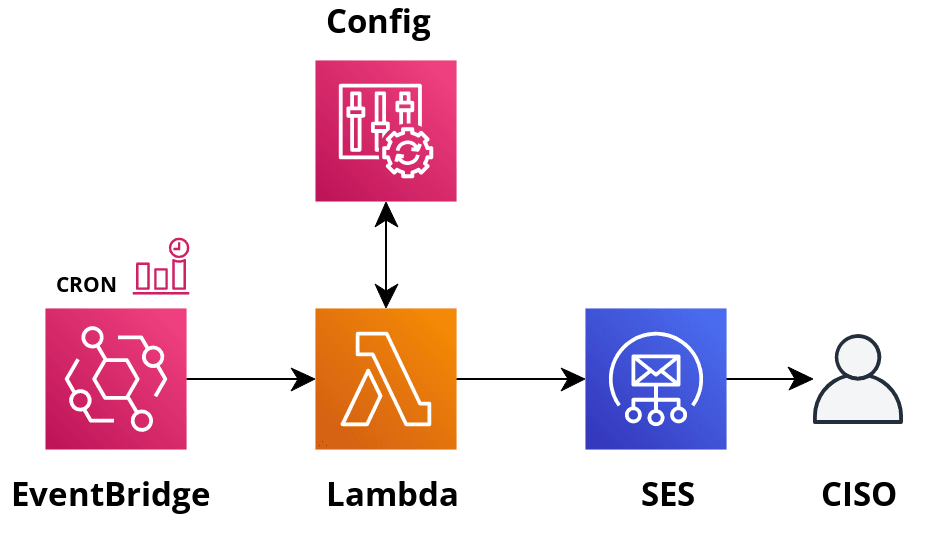 A week has passed, and the remediation efforts are still on-going from the previous findings of non-compliant AWS Lambda Functions. Now, the CISO wants a progress report ASAP! In fact, this report should be emailed every week.Solution: Well, it’s a good thing that you are getting better at this! Grab a DevOps colleague, and let’s plan some automation to go along with the custom query we just ran. Using Boto3 (AWS SDK for Python) and Amazon SES, we can customize the results in HTML and send the report off to the CISO, and to your Manager. The architecture will look something like this:
